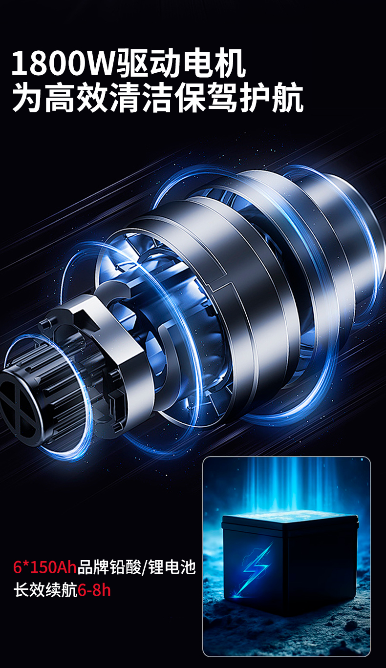 進(jìn)口電控系統(tǒng),擁有過流、欠壓保護(hù),加重底盤,垃圾箱容量大,清潔能力大